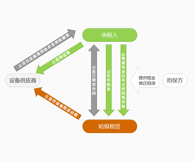 產品定義:哈銀租賃根據承租人對租賃物和供貨人的選擇或認可,向供貨人購買選定設備,提供給承租人使用,承租人根據雙方約定的利率、期限,按期足額支付租金的業務形式。租賃期滿,設備歸承租人所有。
