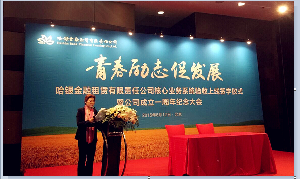 ??????? 2015年6月12日,哈銀租賃核心業(yè)務系統(tǒng)正式上線簽字儀式暨公司成立一周年紀念大會在北京舉行,哈爾濱銀行黨委書記、董事長郭志文,公司董事長高淑珍,經(jīng)營班子及全體員工參加主題活動,黑龍江省銀監(jiān)局派出相關人員參加活動。
